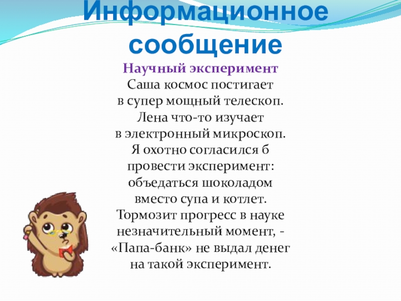 Информационное сообщениеНаучный экспериментСаша космос постигаетв супер мощный телескоп.Лена что-то изучаетв электронный микроскоп.Я охотно согласился бпровести эксперимент:объедаться шоколадомвместо