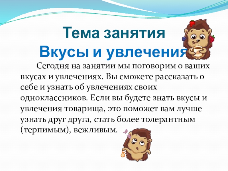 и увлечениях. Вы сможете рассказать о себе и узнать об увлечениях своих одноклассников. Если вы будете знать вкусы и увлечения товарища, это поможет вам лучше узнать друг друга, стать более толерантным (терпимым), вежливым.