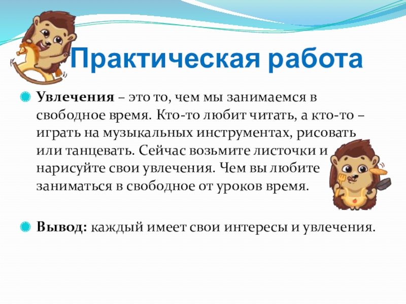 Практическая работаУвлечения – это то, чем мы занимаемся в свободное время. Кто-то любит читать, а кто-то –