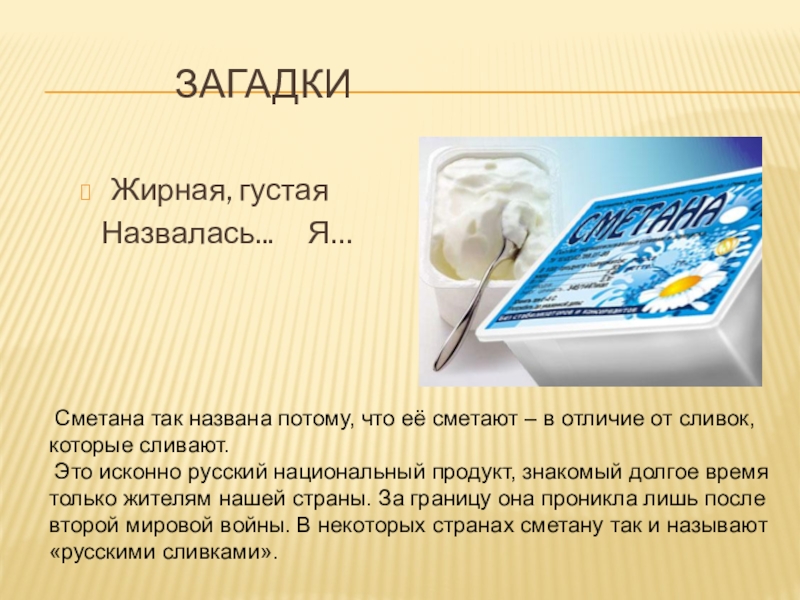 Это исконно русский национальный продукт, знакомый долгое время только жителям нашей страны. За границу она проникла лишь после второй мировой войны. В некоторых странах сметану так и называют «русскими сливками».