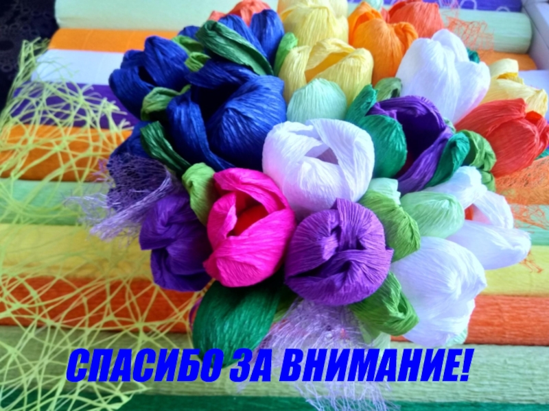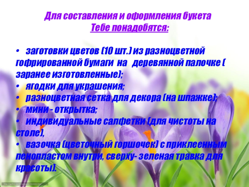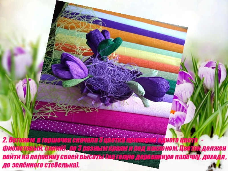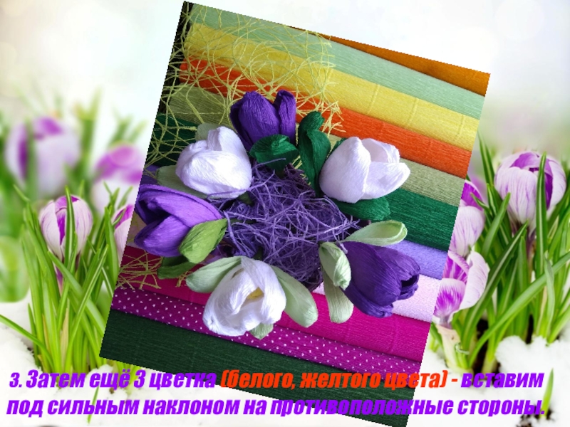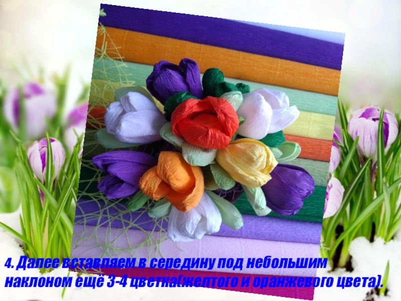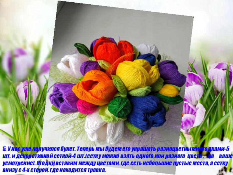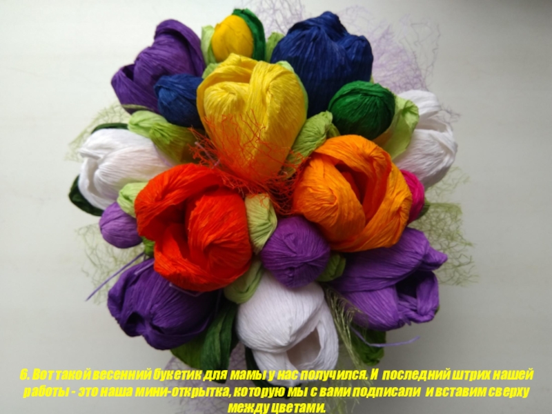 6. Вот такой весенний букетик для мамы у нас получился. И последний штрих нашей работы - это наша мини-открытка, которую мы с вами подписали и вставим сверху между цветами.