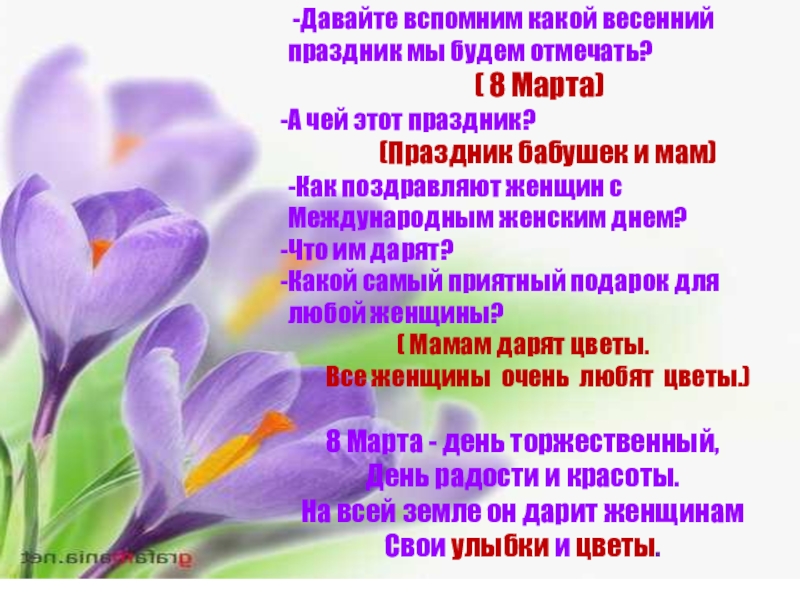 -Давайте вспомним какой весенний праздник мы будем отмечать?