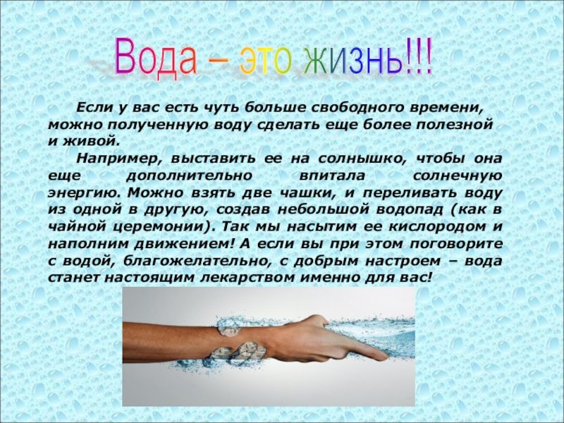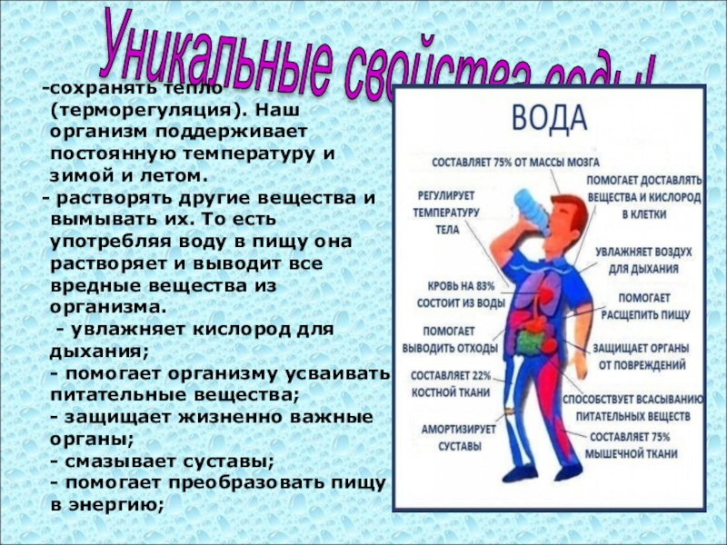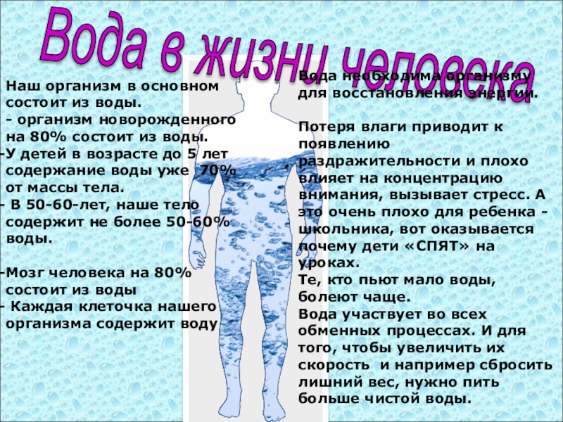 Вода участвует во всех обменных процессах. И для того, чтобы увеличить их скорость и например сбросить лишний вес, нужно пить больше чистой воды.