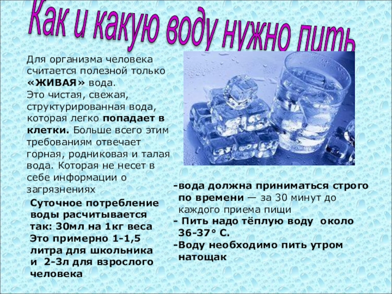 вода должна приниматься строго по времени — за 30 минут до каждого приема пищи