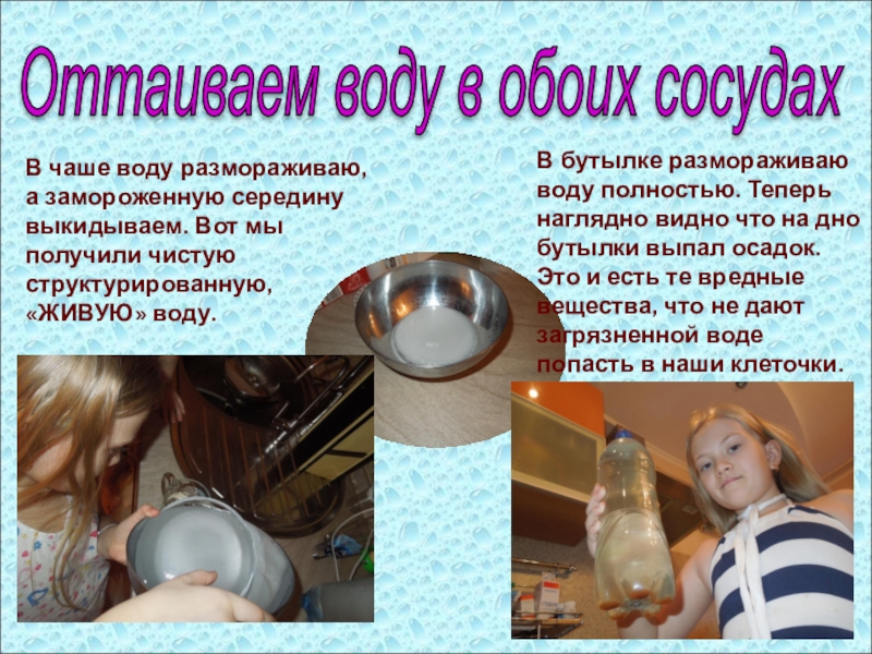 В бутылке размораживаю воду полностью. Теперь наглядно видно что на дно бутылки выпал осадок. Это и есть те вредные вещества, что не дают загрязненной воде попасть в наши клеточки.