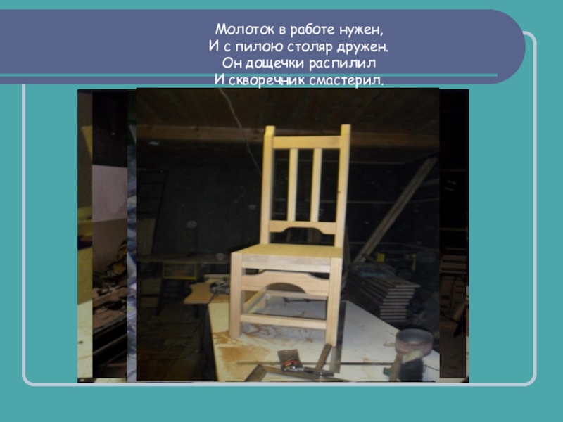Молоток в работе нужен,И с пилою столяр дружен.Он дощечки распилилИ скворечник смастерил.