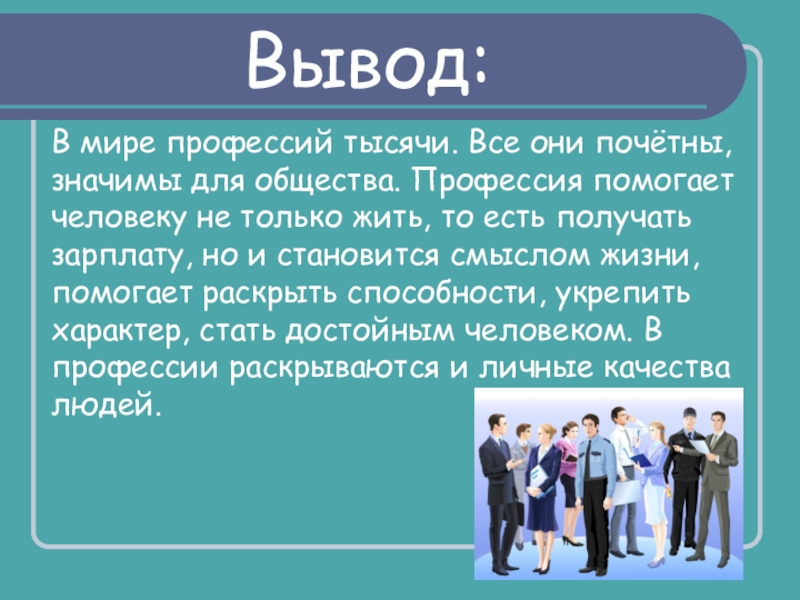 Вывод:В мире профессий тысячи. Все они почётны, значимы для общества. Профессия помогает человеку не только жить, то