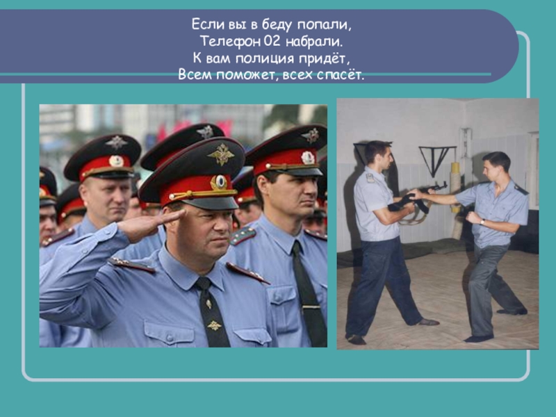 Если вы в беду попали,Телефон 02 набрали.К вам полиция придёт,Всем поможет, всех спасёт.
