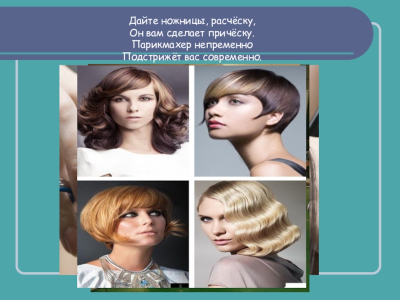 Дайте ножницы, расчёску,Он вам сделает причёску.Парикмахер непременно Подстрижёт вас современно.
