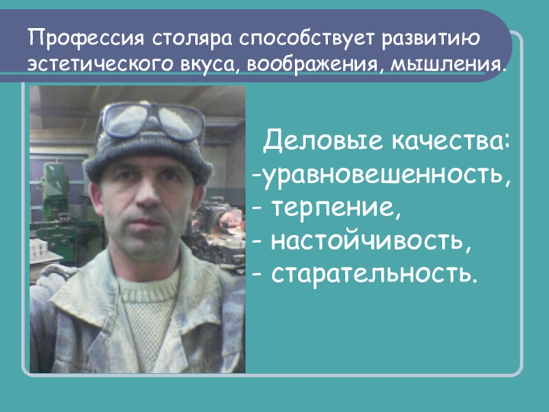 Профессия столяра способствует развитию эстетического вкуса, воображения, мышления.Деловые качества:уравновешенность, терпение, настойчивость, старательность.