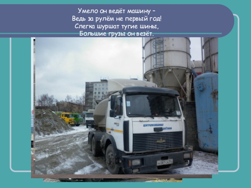 Умело он ведёт машину –Ведь за рулём не первый год!Слегка шуршат тугие шины,Большие грузы он везёт.