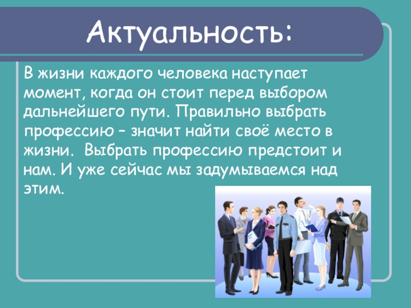 Актуальность:В жизни каждого человека наступает момент, когда он стоит перед выбором дальнейшего пути. Правильно выбрать профессию – значит найти своё место в жизни. Выбрать профессию предстоит и нам. И уже сейчас мы задумываемся над этим.
