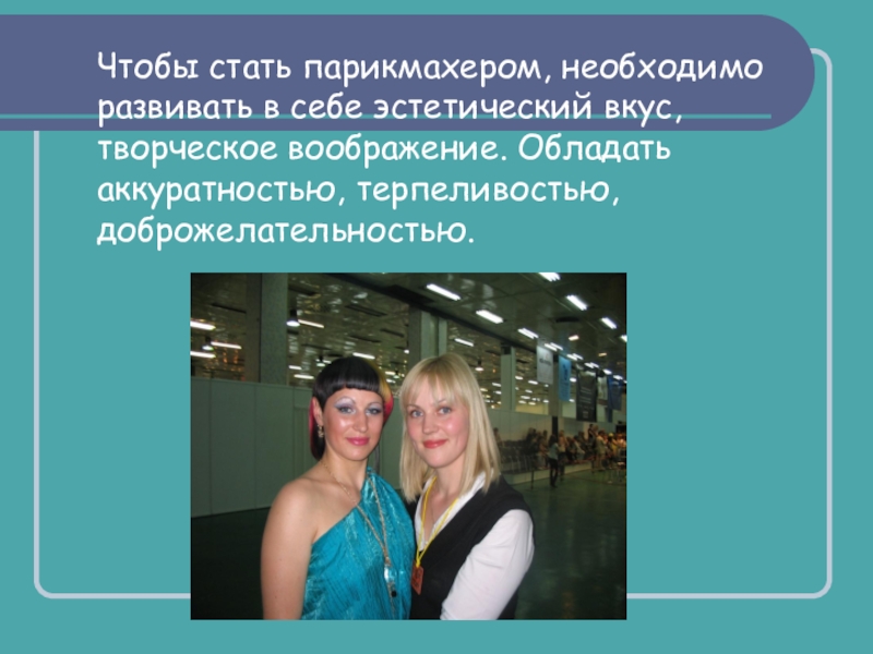 Слайд 13Чтобы стать парикмахером, необходимо развивать в себе эстетический вкус, творческое воображение.