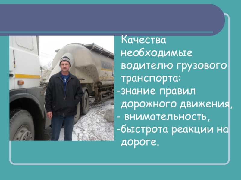 Слайд 11Качества необходимые водителю грузового транспорта: