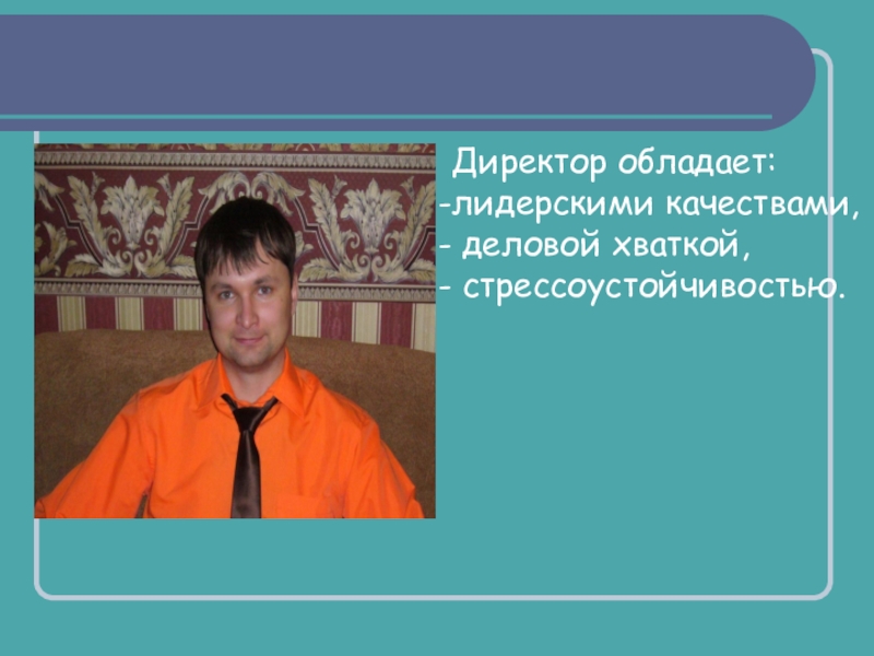 Директор обладает:лидерскими качествами, деловой хваткой, стрессоустойчивостью.