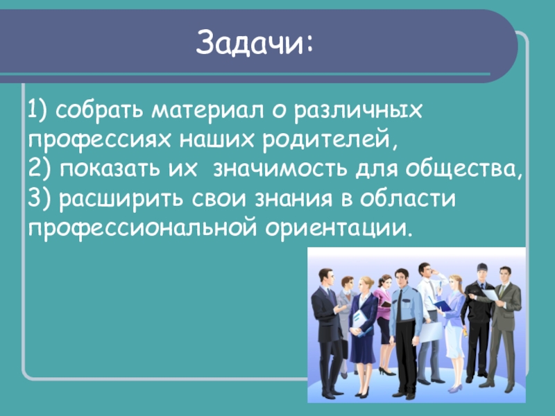Задачи:1) собрать материал о различных профессиях наших родителей,2) показать их значимость для общества,3) расширить свои знания в