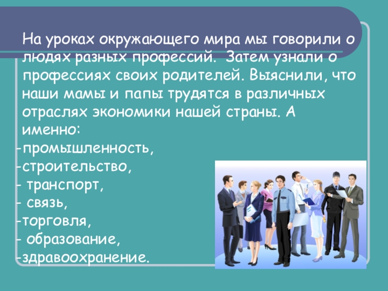 Слайд 7На уроках окружающего мира мы говорили о людях разных профессий. Затем
