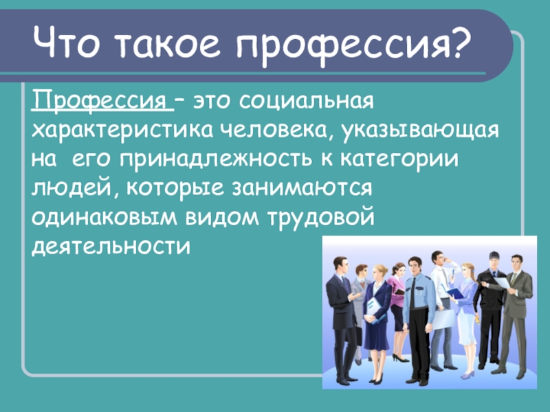 Что такое профессия?Профессия – это социальная характеристика человека, указывающая на его принадлежность к категории людей, которые занимаются