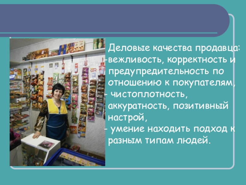 Слайд 15Деловые качества продавца: