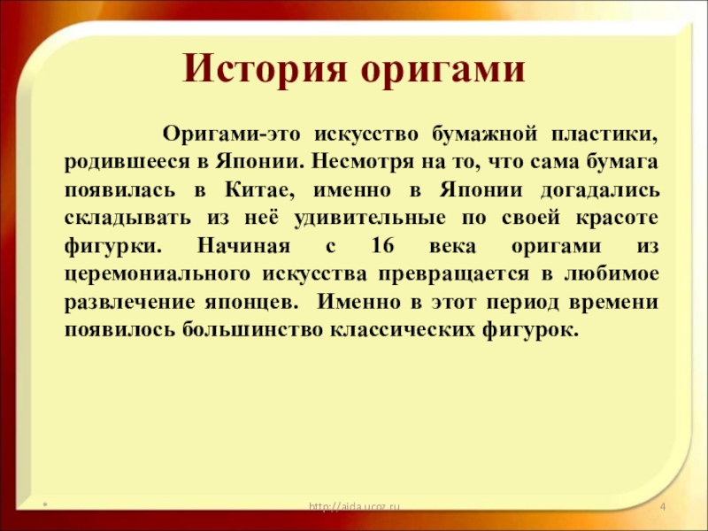 в Японии. Несмотря на то, что сама бумага появилась в Китае, именно в Японии догадались складывать из неё удивительные по своей красоте фигурки. Начиная с 16 века оригами из церемониального искусства превращается в любимое развлечение японцев. Именно в этот период времени появилось большинство классических фигурок.