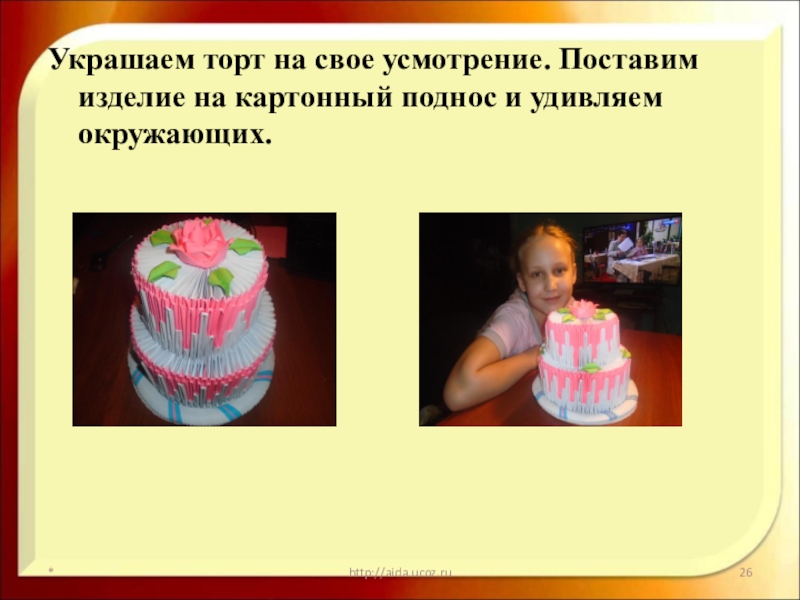 Слайд 26Украшаем торт на свое усмотрение. Поставим изделие на картонный поднос и