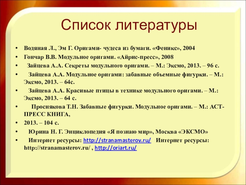 Зайцева А.А. Секреты модульного оригами. – М.: Эксмо, 2013. – 96 с.