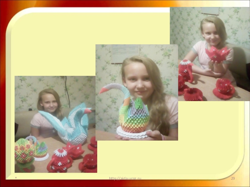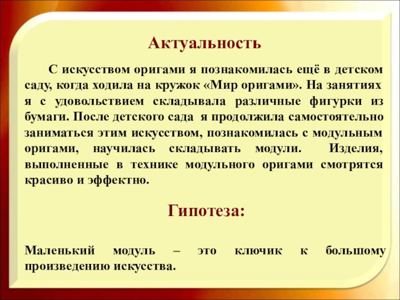 С искусством оригами я познакомилась ещё в детском саду, когда ходила на кружок «Мир оригами». На занятиях я с удовольствием складывала различные фигурки из бумаги. После детского сада я продолжила самостоятельно заниматься этим искусством, познакомилась с модульным оригами, научилась складывать модули. Изделия, выполненные в технике модульного оригами смотрятся красиво и эффектно.