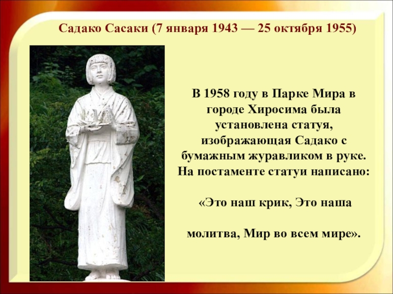 Слайд 8Садако Сасаки (7 января 1943 — 25 октября 1955)