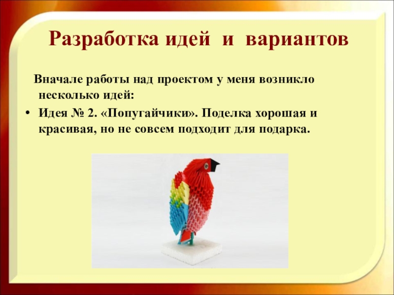 Идея № 2. «Попугайчики». Поделка хорошая и красивая, но не совсем подходит для подарка.