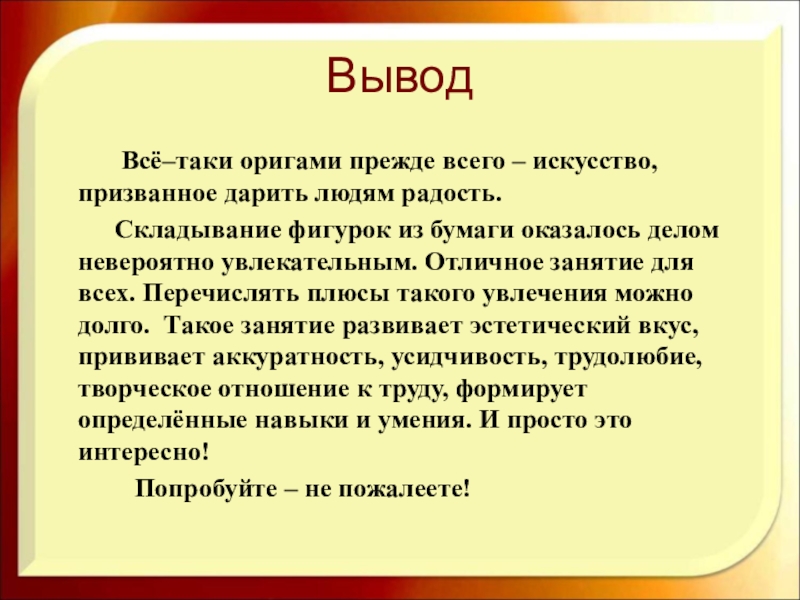 Складывание фигурок из бумаги оказалось делом невероятно увлекательным. Отличное занятие для всех. Перечислять плюсы такого увлечения можно долго. Такое занятие развивает эстетический вкус, прививает аккуратность, усидчивость, трудолюбие, творческое отношение к труду, формирует определённые навыки и умения. И просто это интересно!