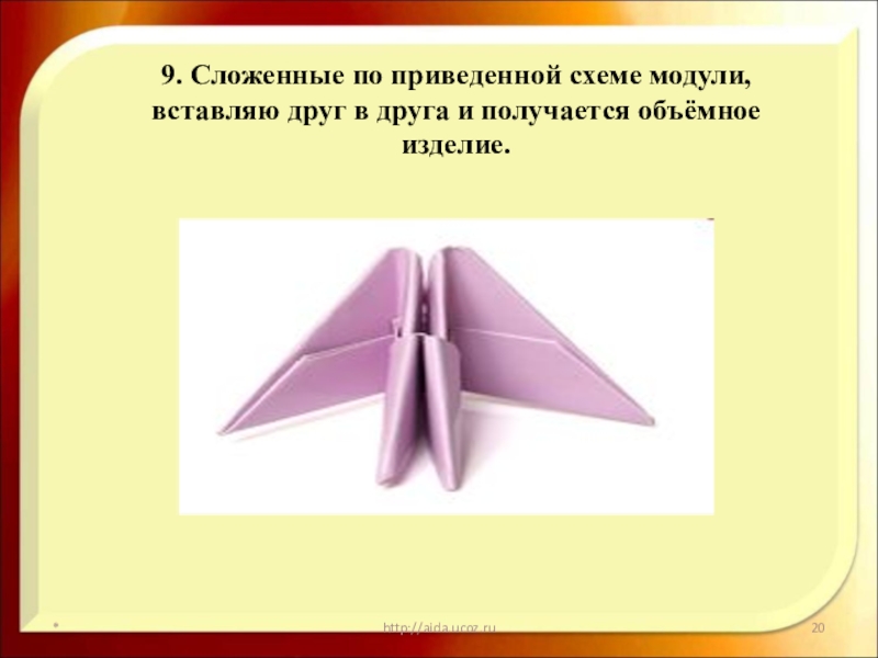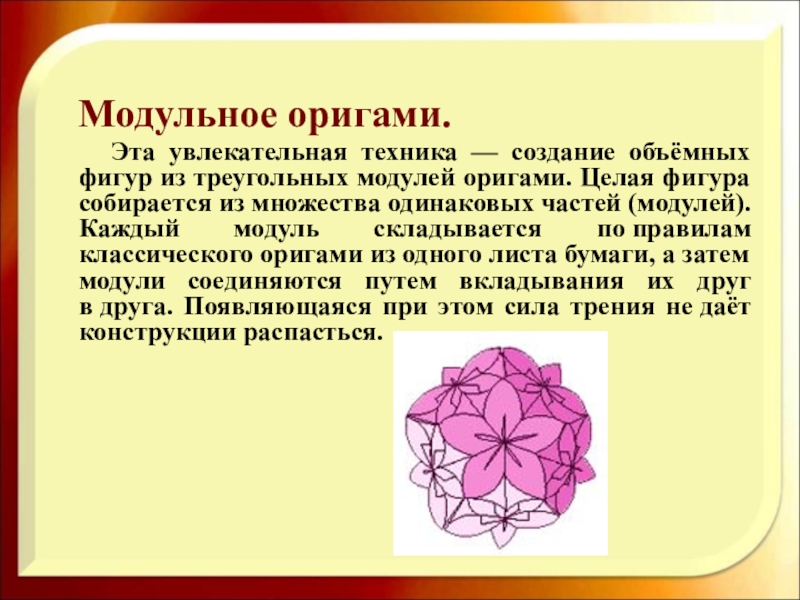 создание объёмных фигур из треугольных модулей оригами. Целая фигура собирается из множества одинаковых частей (модулей). Каждый модуль складывается по правилам классического оригами из одного листа бумаги, а затем модули соединяются путем вкладывания их друг в друга. Появляющаяся при этом сила трения не даёт конструкции распасться.