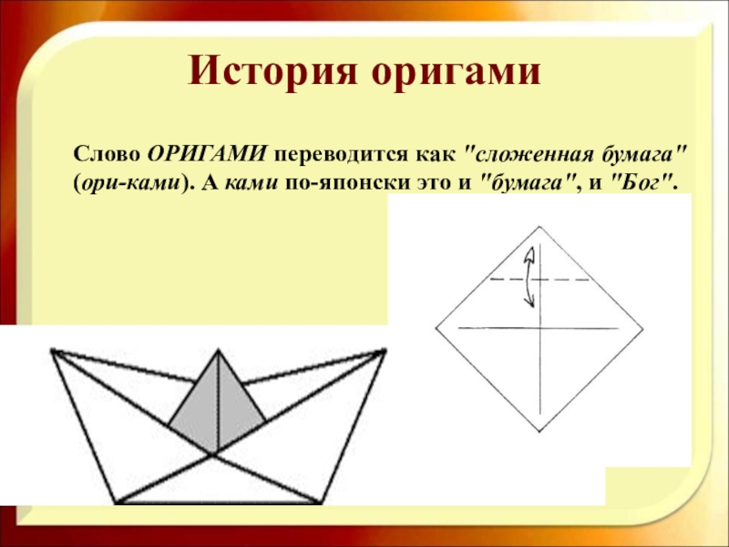 Слово ОРИГАМИ переводится как "сложенная бумага" (ори-ками). А ками по-японски