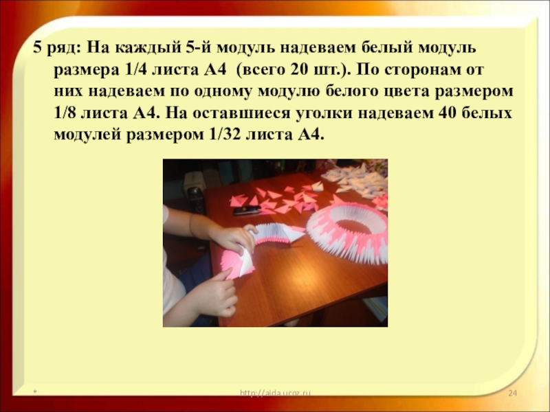 А4 (всего 20 шт.). По сторонам от них надеваем по одному модулю белого цвета размером 1/8 листа А4. На оставшиеся уголки надеваем 40 белых модулей размером 1/32 листа А4.