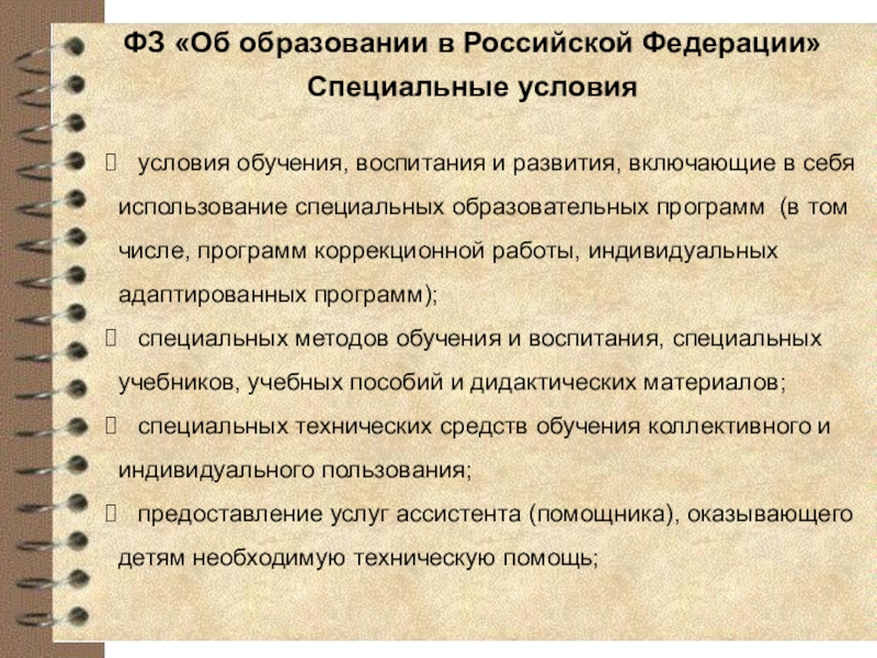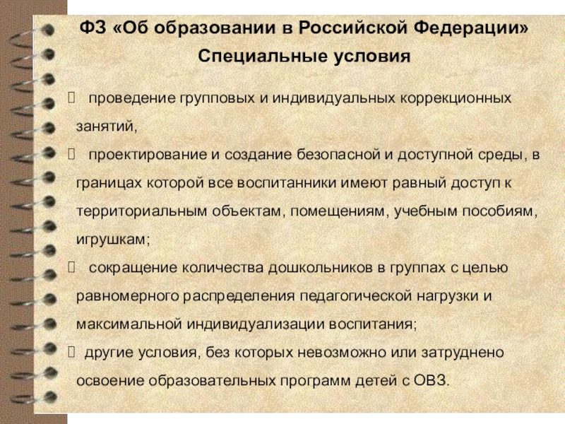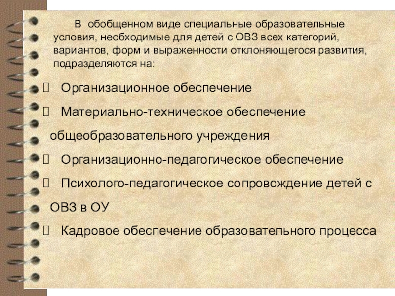 В обобщенном виде специальные образовательные условия, необходимые для детей с ОВЗ всех категорий, вариантов, форм и выраженности отклоняющегося развития, подразделяются на: