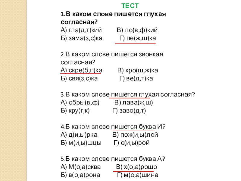 ТЕСТ1.В каком слове пишется глухая согласная?А) гла(д,т)кий     В) ло(в,ф)кийБ) зама(з,с)ка
