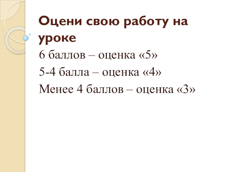 Оцени свою работу на уроке6 баллов – оценка «5»5-4 балла – оценка «4»Менее 4 баллов – оценка