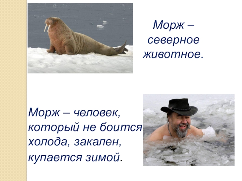 Морж – человек, который не боится холода, закален, купается зимой.Морж – северное животное.