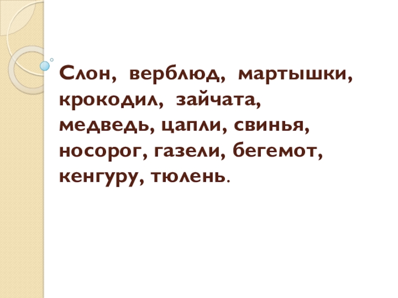 Слайд 2Слон, верблюд, мартышки, крокодил, зайчата, медведь, цапли, свинья, носорог, газели, бегемот,