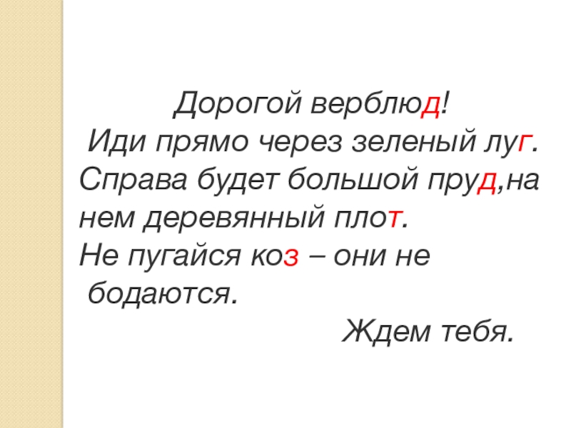 Дорогой верблюд! Иди прямо через зеленый луг. Справа будет большой пруд,на нем деревянный плот. Не пугайся коз