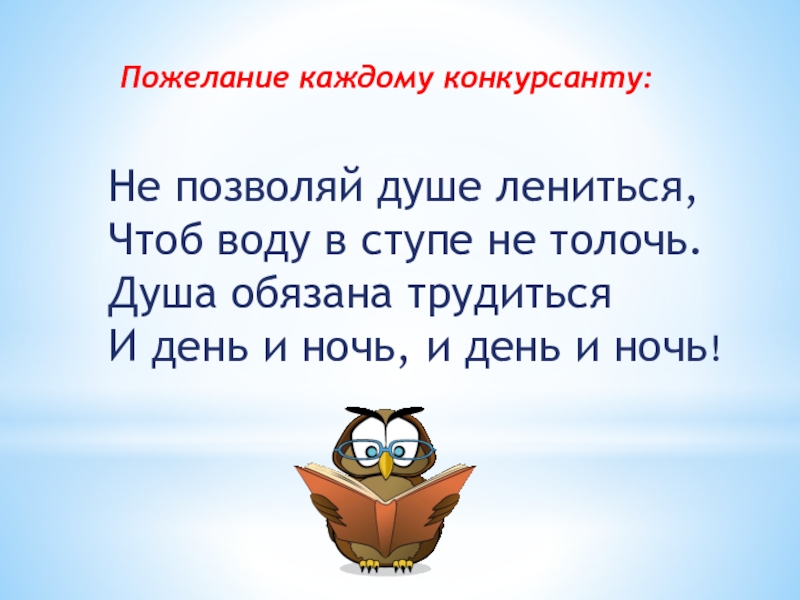 Пожелание каждому конкурсанту:Не позволяй душе лениться,Чтоб воду в ступе не толочь.Душа обязана трудитьсяИ день и ночь, и