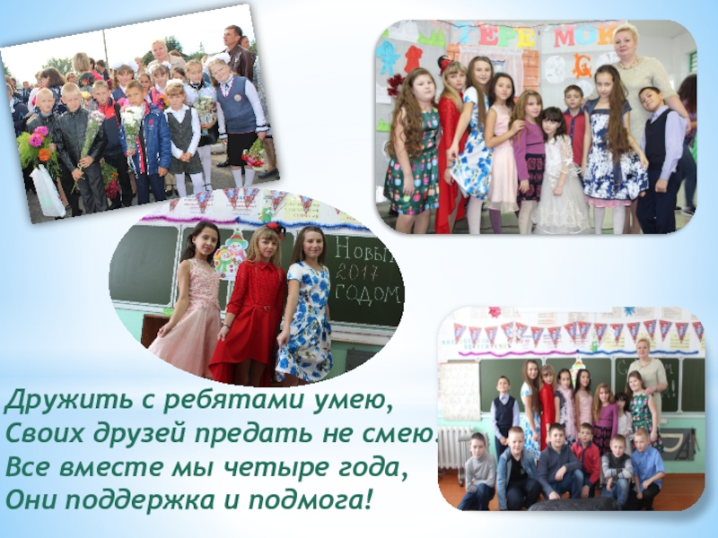 Дружить с ребятами умею,Своих друзей предать не смею.Все вместе мы четыре года,Они поддержка и подмога!