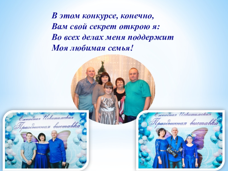 В этом конкурсе, конечно,Вам свой секрет открою я:Во всех делах меня поддержитМоя любимая семья!