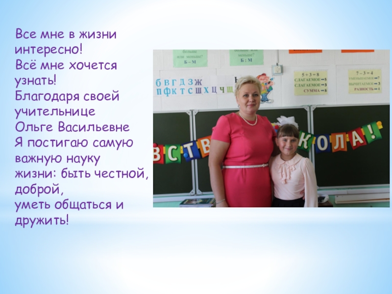 Все мне в жизни интересно!Всё мне хочется узнать!Благодаря своей учительницеОльге ВасильевнеЯ постигаю самую важную наукужизни: быть честной,