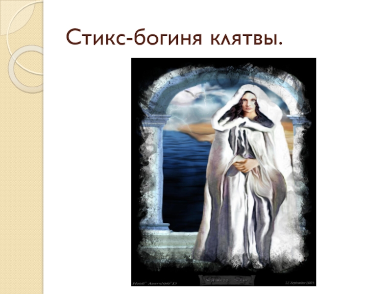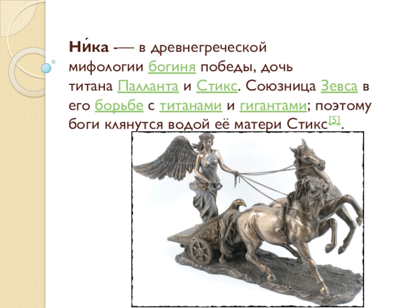 Слайд 1Ни́ка -— в древнегреческой мифологии богиня победы, дочь титана Палланта и Стикс. Союзница Зевса в его борьбе с титанами и гигантами; поэтому боги клянутся