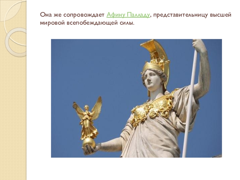 Слайд 6Она же сопровождает Афину Палладу, представительницу высшей мировой всепобеждающей силы.