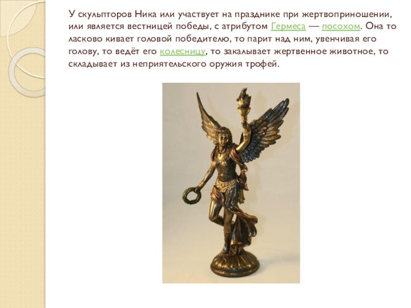 вестницей победы, с атрибутом Гермеса — посохом. Она то ласково кивает головой победителю, то парит над ним, увенчивая его голову, то ведёт его колесницу, то закалывает жертвенное животное, то складывает из неприятельского оружия трофей.
