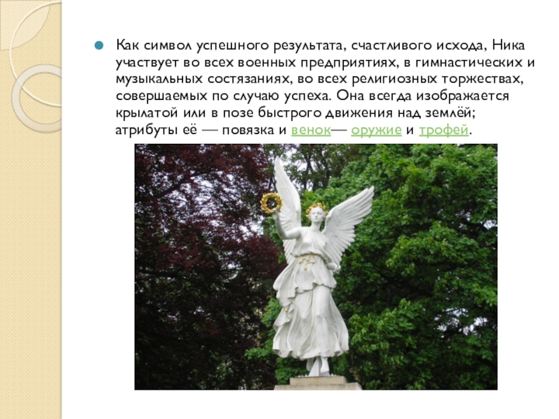 предприятиях, в гимнастических и музыкальных состязаниях, во всех религиозных торжествах, совершаемых по случаю успеха. Она всегда изображается крылатой или в позе быстрого движения над землёй; атрибуты её — повязка и венок— оружие и трофей.