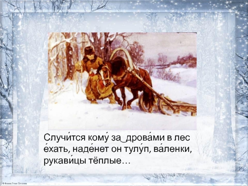 Слайд 25Случи́тся кому́ за͜ дрова́ми в лес е́хать, наде́нет он тулу́п, ва́ленки,
