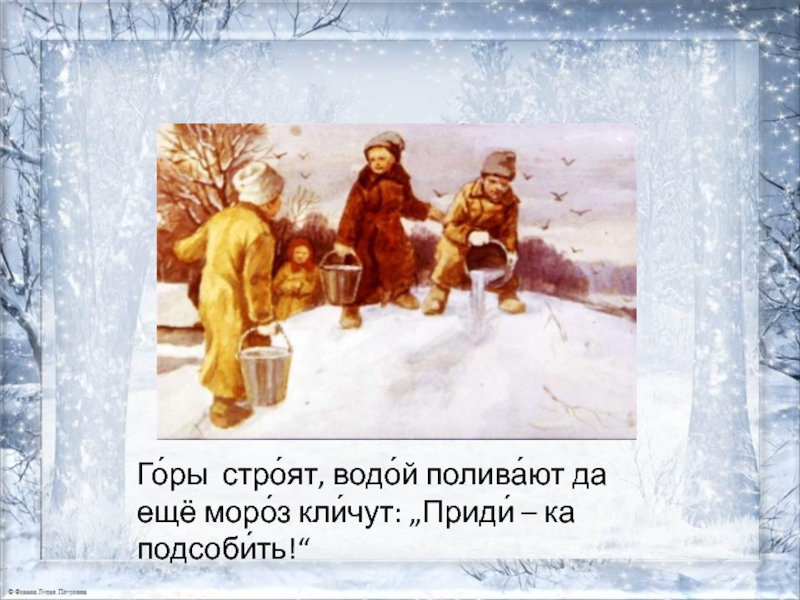 Слайд 29Го́ры стро́ят, водо́й полива́ют да ещё моро́з кли́чут: „Приди́ – ка