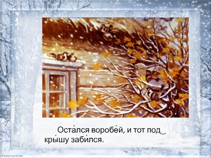 Слайд 8 Оста́лся воробе́й, и тот под͜ кры́шу заби́лся.